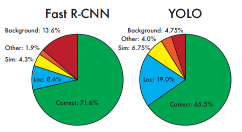 YOLO의 경우 Fast R-CNN에 비해 Background가 매우 감소한 것을 확인할 수 있다.