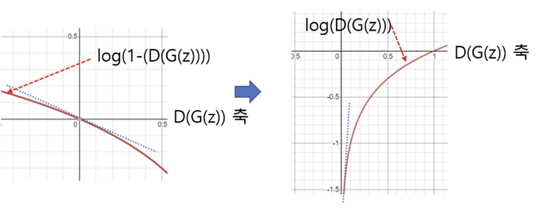 학습 초반에는 G가 정교하지 않은 fake image를 생성하기 때문에 D가 G가 생성해 낸 데이터와 실제 데이터를 잘 구별한다. $log(1-D(G(z)))$에서 $D(G(z))$ 값이 0이면 gradient(경사) 값이 낮기 때문에 saturation(포화) 된 상태이기에 충분한 gradient가 backpropagation 되지 않아 G의 업데이트에 어려움이 생긴다. 이런 경우에는 $log(1-D(G(z)))$를 minimize 하려고 하는 것보다 $log(D(G(z)))$를 maximize 되게끔 학습하는 것이 더 좋다.