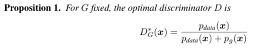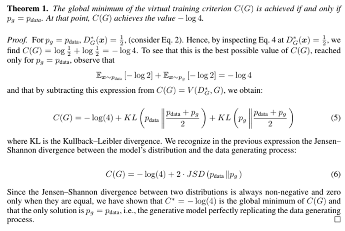Generator 관점에서 value function은 $Pg$ = $Pdata$에서 global optimum 값을 가져야 한다. $D*(x)$ = $1/2$ 값을 가진다는 건 discriminator가 가짜 이미지와 진짜 이미지를 판별할 확률이 $1/2$이라는 것이다. 즉, 가짜와 진짜를 구별하지 못하는 상태이다. 이처럼 $V(D, G)$값이 $1/2$에 도달하면 학습을 종료한다.