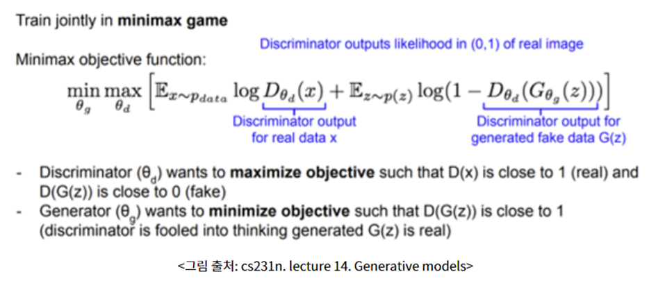 - G는 D가 G에서 온 data를 real image data로 착각할 확률을 극대화하는 게 목적이다. -> minimax two-player game