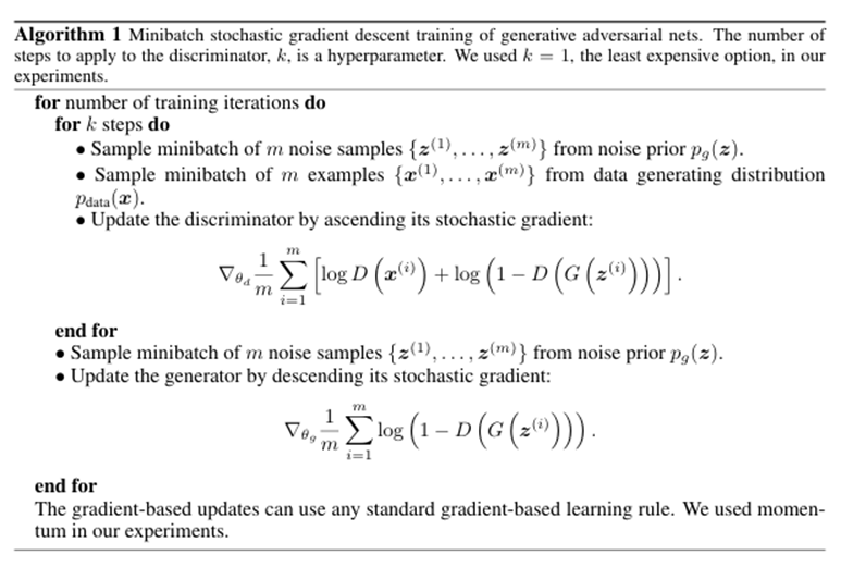 - $V(G, D)$에서 $log(1-D(G(z)))$를 최소화하도록 경사하강법을 이용해 generator parameter 업데이트 (1 step)