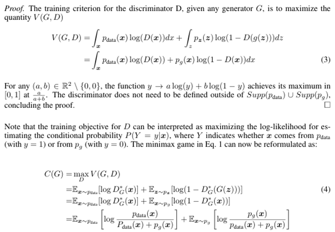 Generator 관점에서 value function은 $Pg$ = $Pdata$에서 global optimum 값을 가져야 한다. $D*(x)$ = $1/2$ 값을 가진다는 건 discriminator가 가짜 이미지와 진짜 이미지를 판별할 확률이 $1/2$이라는 것이다. 즉, 가짜와 진짜를 구별하지 못하는 상태이다. 이처럼 $V(D, G)$값이 $1/2$에 도달하면 학습을 종료한다.