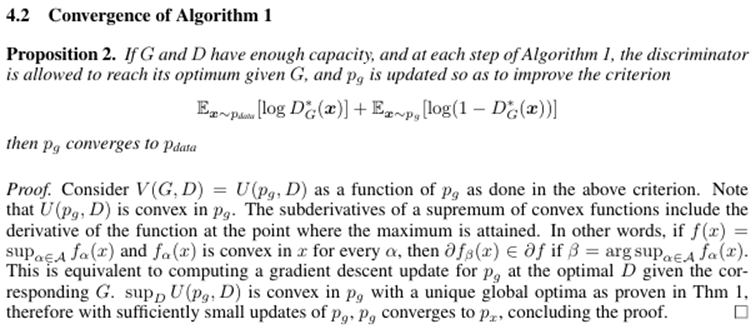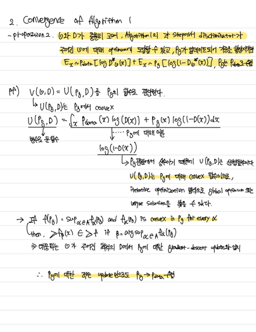 Generative model인 $Pg$ 관점에서 loss함수가 convergence(수렴) 할 수 있는지 여부를 따져야 한다. 이를 위해서는 D를 고정시켰을 때 학습하면서 변화하는 $Pg$에 따라 loss 함수가 convex한지 알아야 한다. $U(Pg, D)$는 $Pg$에 대해 convex 함수이므로, iterative optimization 방식으로 최적해를 찾을 수 있다.