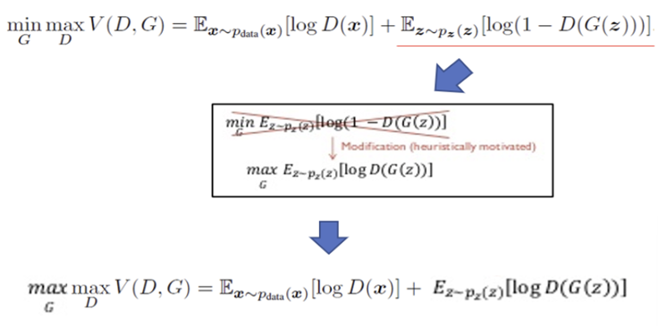 학습 초반에는 G가 정교하지 않은 fake image를 생성하기 때문에 D가 G가 생성해 낸 데이터와 실제 데이터를 잘 구별한다. $log(1-D(G(z)))$에서 $D(G(z))$ 값이 0이면 gradient(경사) 값이 낮기 때문에 saturation(포화) 된 상태이기에 충분한 gradient가 backpropagation 되지 않아 G의 업데이트에 어려움이 생긴다. 이런 경우에는 $log(1-D(G(z)))$를 minimize 하려고 하는 것보다 $log(D(G(z)))$를 maximize 되게끔 학습하는 것이 더 좋다.