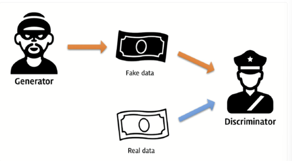 지폐위조범(Generator, 생성자)은 경찰을 최대한 속이려고 하고 반대로 경찰(Discriminator, 판별자)은 위조된 지폐를 진짜와 감별하려고(Classify) 노력한다. 이런 경쟁 속에서 두 그룹 모두 속이고 구별하는 서로의 능력이 발전하고 결과적으로 경찰이 진짜 지폐와 위조지폐를 구별할 수 없을 정도(구별할 확률 p=0.5)에 이르게 된다.