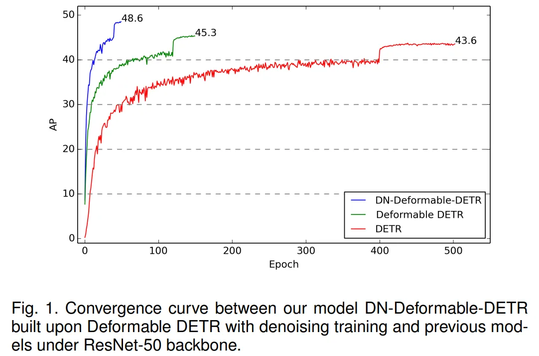 - DN-DETR는 초기 학습 단계에서 더 정확한 GT를 제공받아 일반적인 DETR보다 훨씬 빠르게 수렴한다.