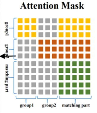 - denoising part와 matching part 간의 정보 누출 방지: matching part가 denoising part를 볼 수 없도록 하여 정보 누출을 방지 → denoising part가 GT와 가깝기 때문