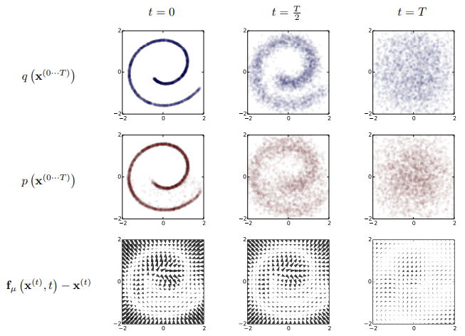 본 논문은 데이터셋의 확률분포를 추정하는 flexible하고 tractable한 확률 모델을 만들어냈다. 논문에서 제시한 diffusion model은 반복적인 diffusion process를 통해 데이터 구조를 천천히 붕괴시키고 이후 reverse process를 학습하여 데이터 구조를 복원한다.