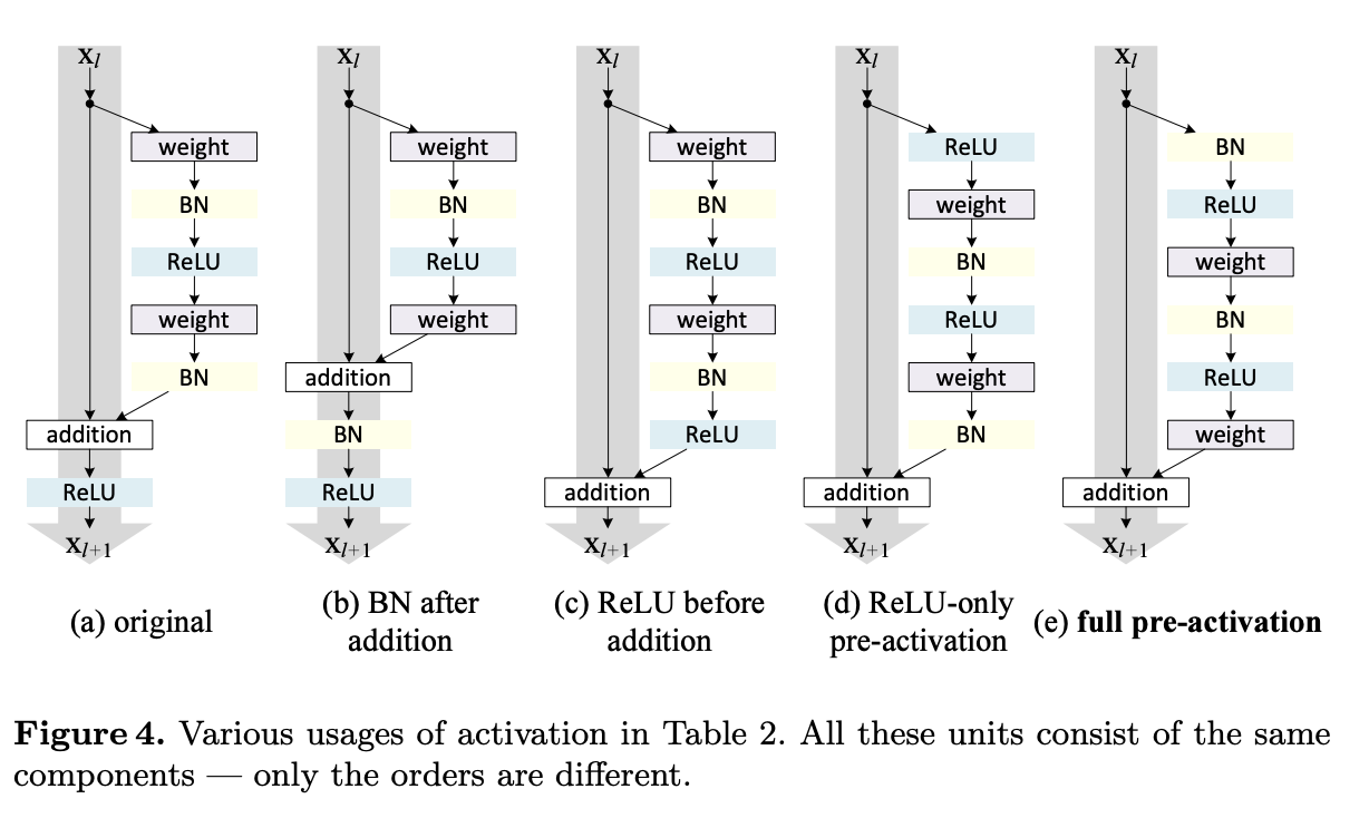 - (e): Batch Normalization과 ReLU를 모두 weight 앞에 위치시킨 full pre-activation 구조이다. 이 구조는 기본 구조보다 좋은 성능을 보여주며, 현재까지 제안된 구조 중 가장 우수한 성능을 기록하였다.