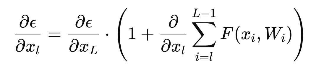 여기서 마지막 항은 Residual Function \(F(x+i, W_i)\)가 \(x_l\)에 미치는 영향을 나타낸다. Residual Function \(F(x+i, W_i)\)는 \(x_l\)과 \(W_i\)를 입력으로 받아 여러 층을 거치면서 계산되므로, 이 부분의 기울기는 가중치 \(W_i\)와 입력 \(x_l\) 모두에 의존한다.