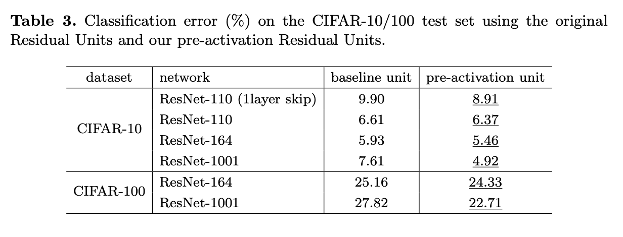 Table 3에서 Depth를 110부터 1001까지 바꿔가며 CIFAR-10/100 데이터셋에서 테스트해본 결과 모든 경우에 pre-activation 구조가 성능이 좋은 것을 볼 수 있다. 따라서 pre-activation 이 post-activation보다 더 성능이 뛰어나다고 볼 수 있다.