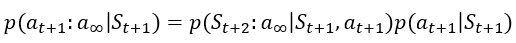 이를 반복하면 $p(S_{t+1}:a_{\infty}|S_t,a_t)=p(S_{t+1}|S_{t},a_{t})p(a_{t+1}|S_{t+1})p(S_{t+2}|S_{t+1},a_{t+1})p(a_{t+2}|S_{t+2})...$이 되게 되는데,