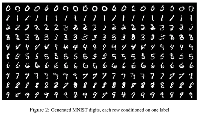 위 논문에서는 CGAN이 class label에 맞는 MNIST 숫자 이미지를 생성하는 것을 보인다. 추가적으로 Multi-Modal model을 학습하는 방법에 대해 설명하며 descriptive tags를 생성하는 방법을 보여주는 image tagging에 대한 예시도 설명한다.