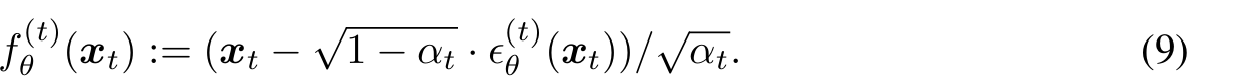 다음으로 각 $ p_{\theta}^{(t)}(x_{t-1}|x_t) $ 가 $q_{\sigma}(x_{t-1}|x_t, x_0) $에 대한 지식을 활용할 수 있는 학습 가능한 generative process $p_{\theta}(x_{0:T})$를 정의한다. 직관적으로, noisy 한 $x_t$가 주어졌을 때 그에 상응하는 $x_0$을 예측한 후 $x_t, x_0$을 모두 이용하여 $q_{\sigma}(x_{t-1}|x_t,x_0) $을 통해 $x_{t-1}$을 구한다고 생각하면 된다. 위의 (4) 번 식과 $x_t$를 통해 $\epsilon_t$ 를 예측하는 모델 $ \epsilon_{\theta}^{(t)}(x_t) $을 사용하면 아래와 같이 $x_0$를 예측할 수 있다.