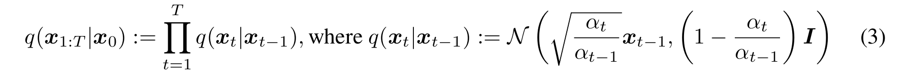 이때 VAE와 같이 전형적인 latent variable model과 다르게 $q(x_{1:T}|x_0)$ 과정을 아래와 같이 고정시키고 학습을 진행한다. 또한 감소 수열 $ \alpha_{1:T} $ ∈ $ (0,1]^T $ 로 매개변수화된 가우시안 분포를 사용한 markov chain을 사용하였다.