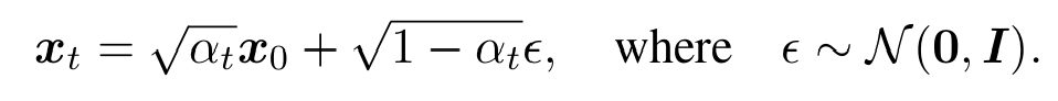 $ q_(x_t|x_{t-1}) $를 forward process라 하고 $x_T$에서 $x_0$로 샘플링하는 Markov chain $p_{\theta}(x_{0:T})$를 generative process라고 하며 이는 reverse process $ q_(x_{t-1}|x_t) $로 근사된다. Forward process는 가우시안 분포의 성질에 의하여 아래와 같이 $x_0$에서 $x_t$로 한 번에 가는 분포를 얻을 수 있고 reparametrization trick을 사용해 다음과 같이 나타낼 수 있다.