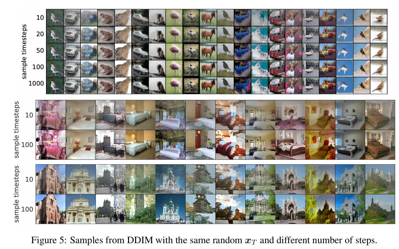 같은 $x_T$에서 이미지 생성을 시작했을 때 step수와 상관 없이 생성하는 이미지가 일관성을 띈다. 이는 $x_T$ 자체가 이미지의 informative latent encoding이 된다는 것을 의미한다.