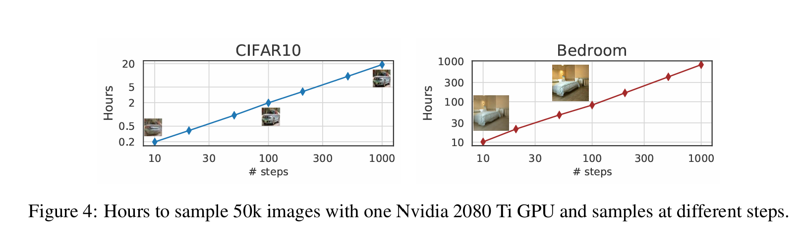 (DDPM으로 50k 개의 32 x 32 이미지를 생성하는데 약 20시간이 걸리지만 GAN을 사용하면 1분 미만이 걸림, Nvidia 2080 Ti GPU 사용 기준)