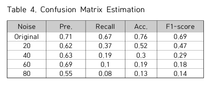 - 위 Confusion Matrix를 바탕으로 노이즈별 Precision, Recall, Accuracy, F1-score를 정리한 표