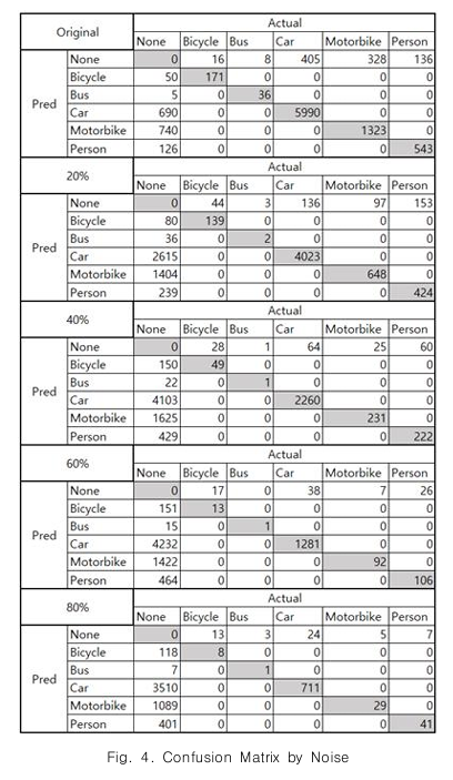 - 전처리 하지 않은 Train data를 사용하여 YOLO 모델을 학습하고 각각 0%(original), 20%, 40%, 60%, 80%의 노이즈를 합성한 Test data로 객체 탐지