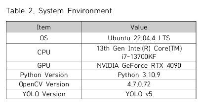 - 모델 생성을 위해 Train data와 Validation data를 사용하여 YOLO v5 모델을 학습, Python OpenCV 라이브러리로 전처리 과정을 거친 Test Data로 객체 탐지율과 탐지 개수 측정