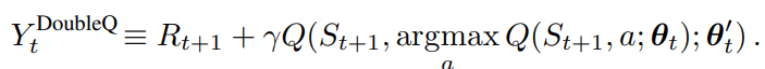 Overestimation 문제를 해결하기 위해 DDQN 논문에서 제안하는 타깃 값은 위와 같다. 위 공식에 따르면, DDQN에서는 타깃 값을 “즉각적인 보상 + gamma*미래 보상” 형태로 정의하며, 여기서 gamma는 할인율(미래 보상의 중요도를 결정하는)을 의미한다. 따라서 gamma*미래 보상은 미래 보상의 현재 가치와 같다.