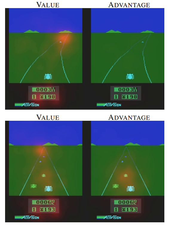 그림의 위와 아래는 각각 다른 timestep에서 saliency map을 가져온 것이다. 첫번째 timestep에서, value network stream은 길에 집중하고, 점수에도 집중한다. advantage stream은 어디에도 집중하지 않는데 어떤 action을 하던 별 영향이 없기 때문이다. 그러나 두번째 timestep에선 advantage stream은 앞의 차에 집중한다. action이 중요한 상황이기 때문이다.