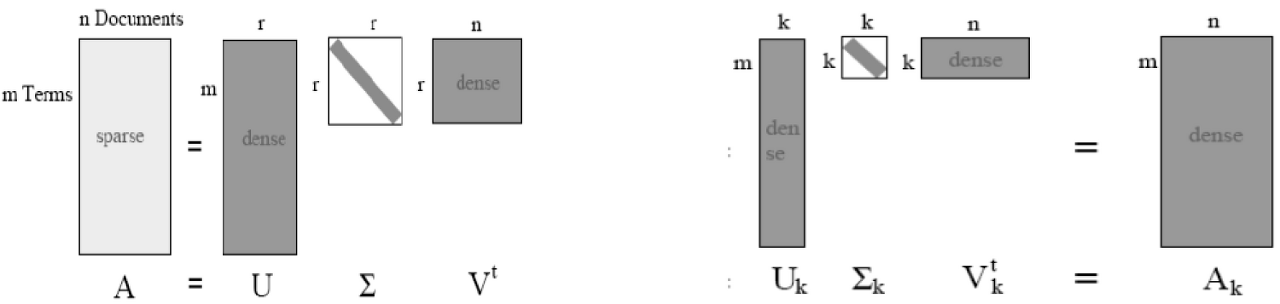 - → k만큼만 남기고 잘라내었다는 것은 중요한 토픽만 남기고 불필요한 토픽은 제거한다는 의미입니다.(문서의 잠재 의미만 남아있다는 말이다.)