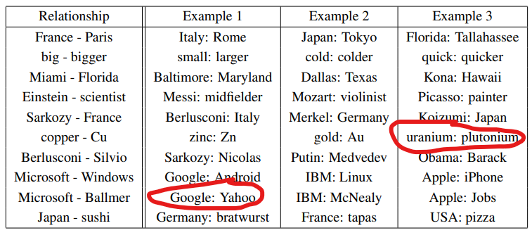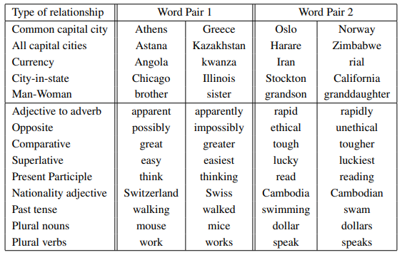 - 전체 데이터셋에는 8,869개의 의미론적 유사도를 갖는 단어 쌍과 10,675개의 구문론적 유사도를 갖는 단어 쌍이 존재한다. 먼저 유사한 단어 쌍의 목록을 수동을 생성하고, 두 단어 쌍을 연결하여 큰 질문 목록을 만들었다.(무작위로 두 단어 쌍을 선택하여 질문 생성)