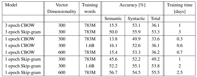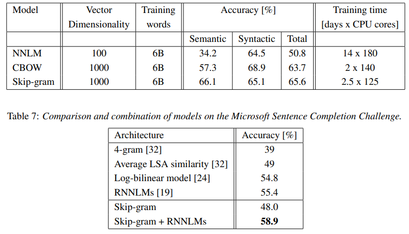 - Skip-gram 구조는 의미론적인 유사도를 묻는 과제에서 탁월한 성능을 보여주었고, 문법적인 유사도를 묻는 작업에서는 CBOW보다 살짝 못 미치는 성적을 보여주었다.