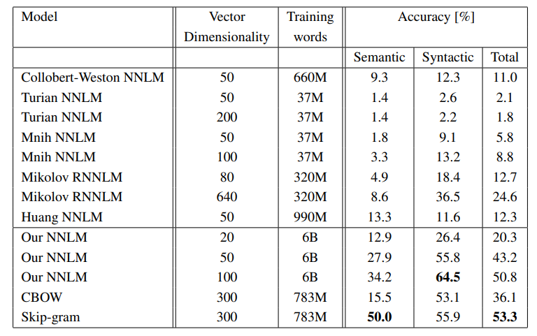 - RNNLM은 단일 cpu에서 훈련하는데 약 8주가 걸렸고, NNLM은 DistBelief parallel training을 사용하여 640개의 hidden units을 feedforward NNLM을 훈련했습니다. 결과적으로 CBOW는 문법적인 유사도를 문는 작업에서 탁월한 성능을 보여주었다.