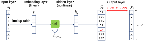 - RNNLM은 모델의 순서를 지정해야하는 NNLM의 한계를 극복하기위해 제안되었으며, projection layer는 없고 hidden과 output만 있다.