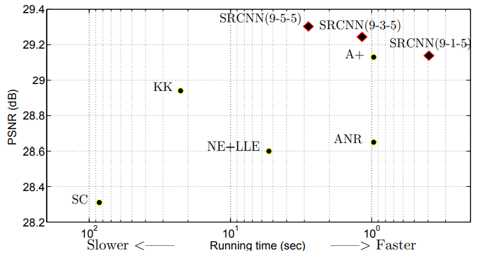 또한 SRCNN은 다른 SOTA 모델들과 비교했을때, 초해상화된 이미지를 만들어내는 시간도 월등히 빠른 것도 위 그래프를 통해 알 수 있습니다.