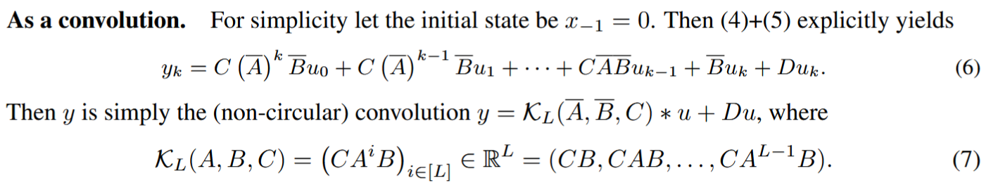 (2) HiPPO는 RNN에 부착된 operator로서 작동하기 때문에 병렬 연산이 작동하지 않고 vanishing gradient 문제가 발생하지만 LSSL에서는 하나의 layer로서 적용되고 비선형 함수가 Layer 내에 존재하지 않기 때문에 convolution처럼 병렬 연산을 진행할 수 있다.