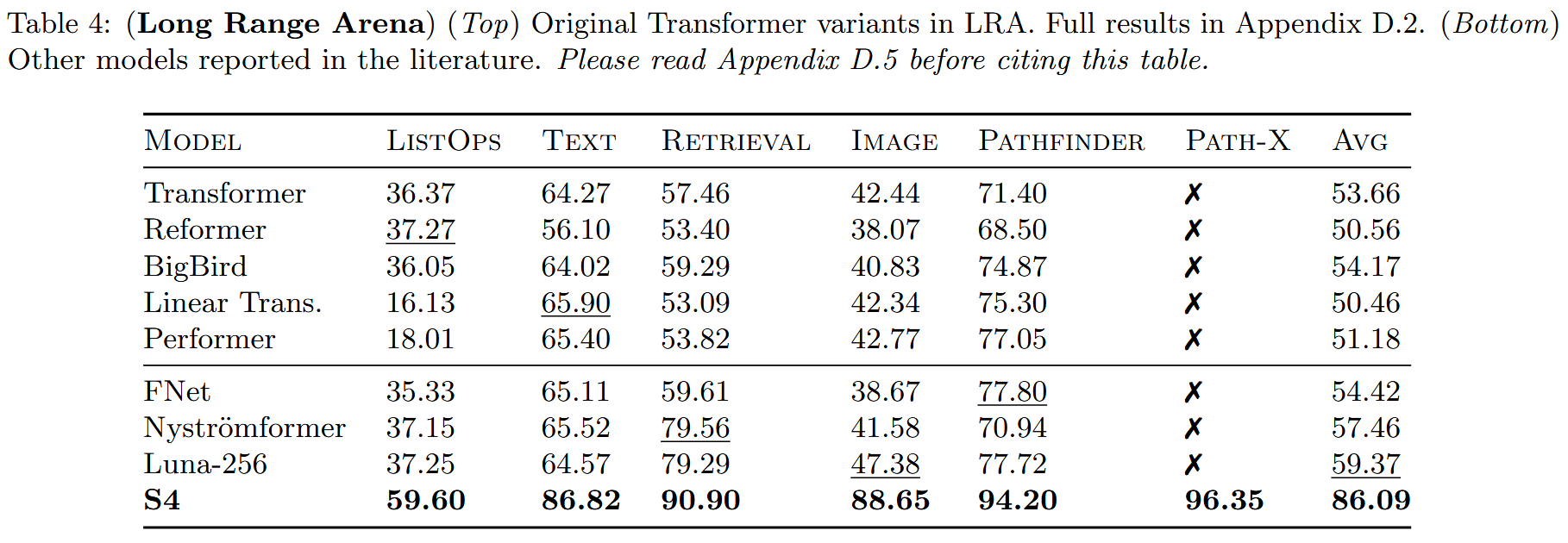 이러한 모델들은 Linear RNN 혹은 State-Space Model이라고 하는데 이 종류의 모델들은 "Long Range Arena"라고 하는 장기 의존성 문제에서 상당히 높은 성능을 보였다. 심지어 transformer보다 압도적인 성능차이를 보였다.