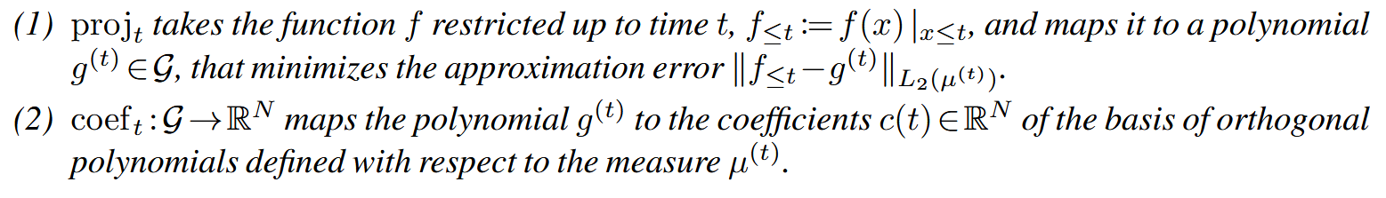 HiPPO는 hidden state가 시간이 지남에 따라 이동하는 모습을 근사하는 것이다. 구체적으로는 어떠한 입력을 받아서 hidden state를 출력하는 함수를 f라고 할 때 (이 함수의 공간이 넓기 때문에) f를 subspace G에 projection하고 이를 1~N차원의 Legendre orthogonal basis의 coefficient로 표현한다.
