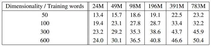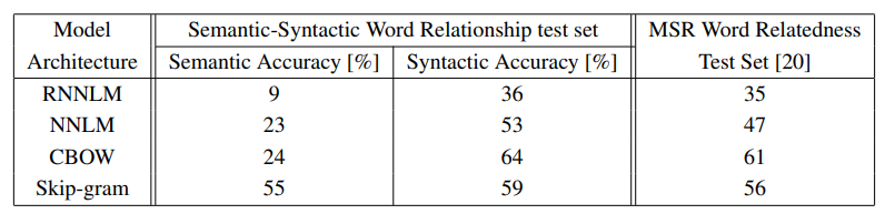 - O = E × T × Q (E는 epoch, T는 training set 단어 수, Q는 각모델 아키텍처에 추가로 정의된 복잡도이다.)