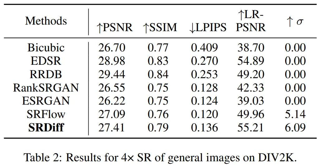- 평가 지표로 PSNR, SSIM, LPIPS, LR-PSNR, 그리고 SR 이미지의 다양성을 나타내는 Pixel Standard Deviation $\sigma$를 사용