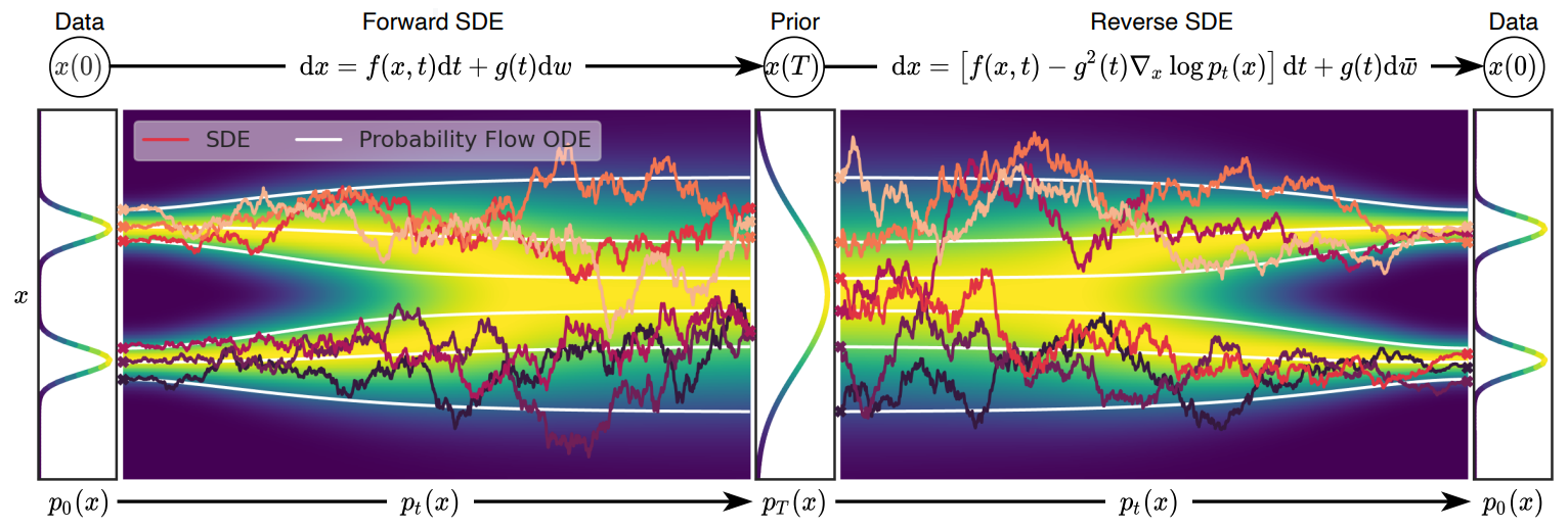 SDE (확률 미분방정식) : 확률론적 요소가 포함된 ODE. 매번 다른 경로를 가지는 해가 도출됨. (확률론적, stochastic)