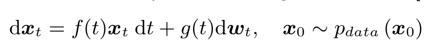 이미지에서 노이즈를 생성하는 Forward process는 Stochastic differential equation (SDE)의 관점에서 서술할 수 있고, 이를 나타내는 식은 다음과 같다.