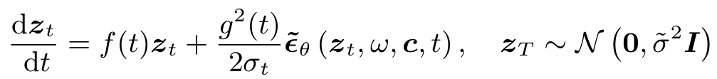 하지만 SDE는 본질적으로 확률론적 효과 $\bar{w_t}$를 포함하기 때문에 직접 soluion을 구하는 것은 복잡하다. 따라서 Probability-flow ODE (PF-ODE)를 새롭게 정의하여 결정론적인 solution을 구하도록 하며, 이 결과는 SDE의 연산 결과인 $q_t(x_t)$와 같은 분포를 가진다고 알려졌다.