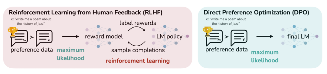 위 그림은 RLHF와 DPO의 차이를 직관적으로 보여준다. 이 내용을 표로 요약하면 다음과 같다.