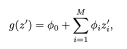 f를 기존 모델(XGBoost, Random Forest, Ensemble 등), g를 해석 모델이라고 할 때, g의 목표는 f에 가장 근사한 값을 도출하는 것이다. 여기서 해석 모델은 f의 입력값 x를 단순화한 x'를 입력 데이터로 받는다. x'는 함수 h를 통해 x로 복원될 수 있다. 요약하자면
