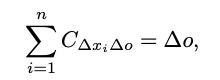 다음 수식은 특정 특성을 부여하지 않았을 때와 부여했을 때의 입력값 차이(델타 xi), 출력값 차이(델타o)를 합산하면 기존 모델의 출력값이 나온다는 내용을 포함한다. 여기서 C는 특성 기여도를 나타낸다.