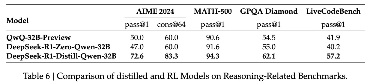 증류 없이도 대규모 RL 훈련을 통해 유사한 성능을 달성할 수 있는가에 답하기 위해, Qwen-32B-Base 모델을 대상으로 수학, 코드, STEM 데이터를 활용한 대규모 RL을 총 10,000 진행하여 훈련을 통해 DeepSeek-R1-Zero-Qwen-32B를 개발했다. Table 6에 제시된 실험 결과에 따르면, DeepSeek-R1-Distill-Qwen-32는 모든 벤치마크에서 DeepSeek-R1-Zero-Qwen-32B를 크게 능가하는 성능을 보였다.