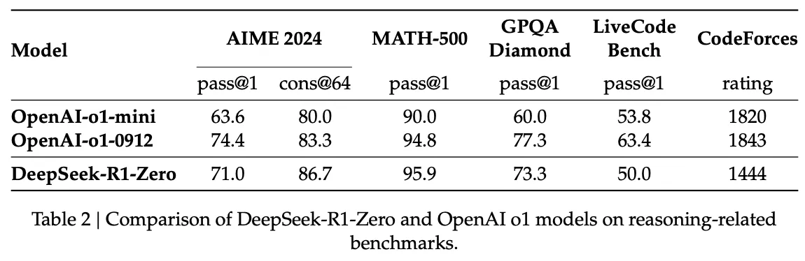 Table 2는 DeepSeek-R1-Zero 모델과 OpenAI-o1-0912 모델을 다양한 추론 관련 벤치마크에서 비교 분석한 표이다. Table 2를 통해 DeepSeek-R1-Zero가 특정 벤치마크에서는 다수결 투표 여부와 관계없이 경쟁력 있는 성능을 달성했고, 추론 작업에서의 추가적인 발전 가능성을 시사하였다.