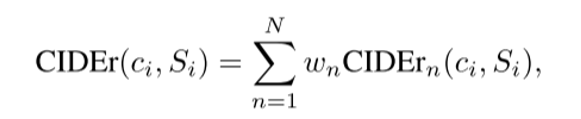최종 CIDEr(Ci, Si) 값은 위와 같이 구함. w_n = 1/N