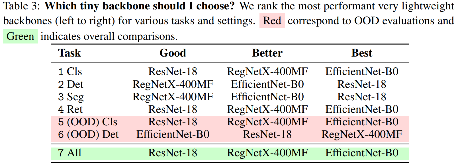 - 빨간색은 OOD task에서의 우수한 상위 3개의 backbone
