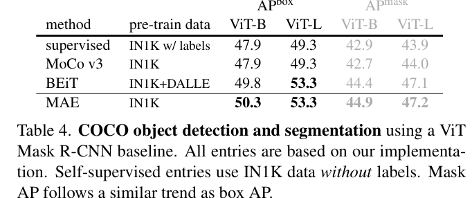 - ViT-L 모델: MAE가 4.0점 더 높음 (53.3 vs. 49.3, APbox).