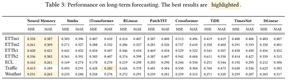 - Neural Memory는 시계열 예측 작업에서도 뛰어난 성능을 발휘하며, 다양한 아키텍처와 비교하여 우수한 성과를 기록